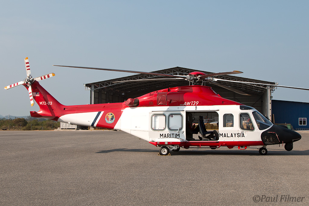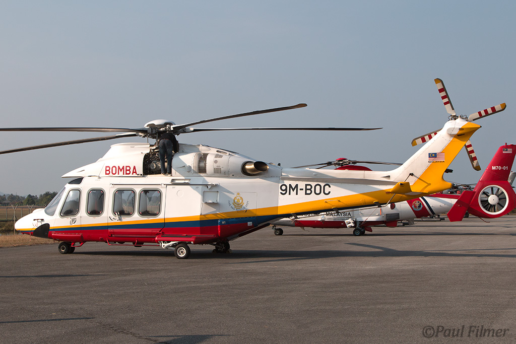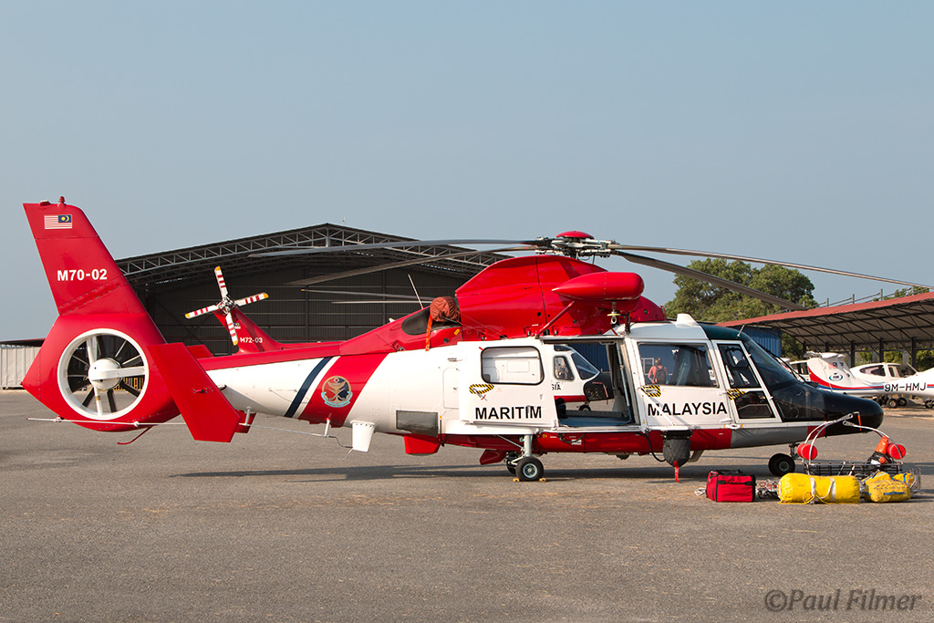 An AS365N3 from the Malaysian Maritime Enforcement Agency deployed divers to set charges and blow up the barge before one of their CL-415MP water bombers arrived to put the resulting flames out.