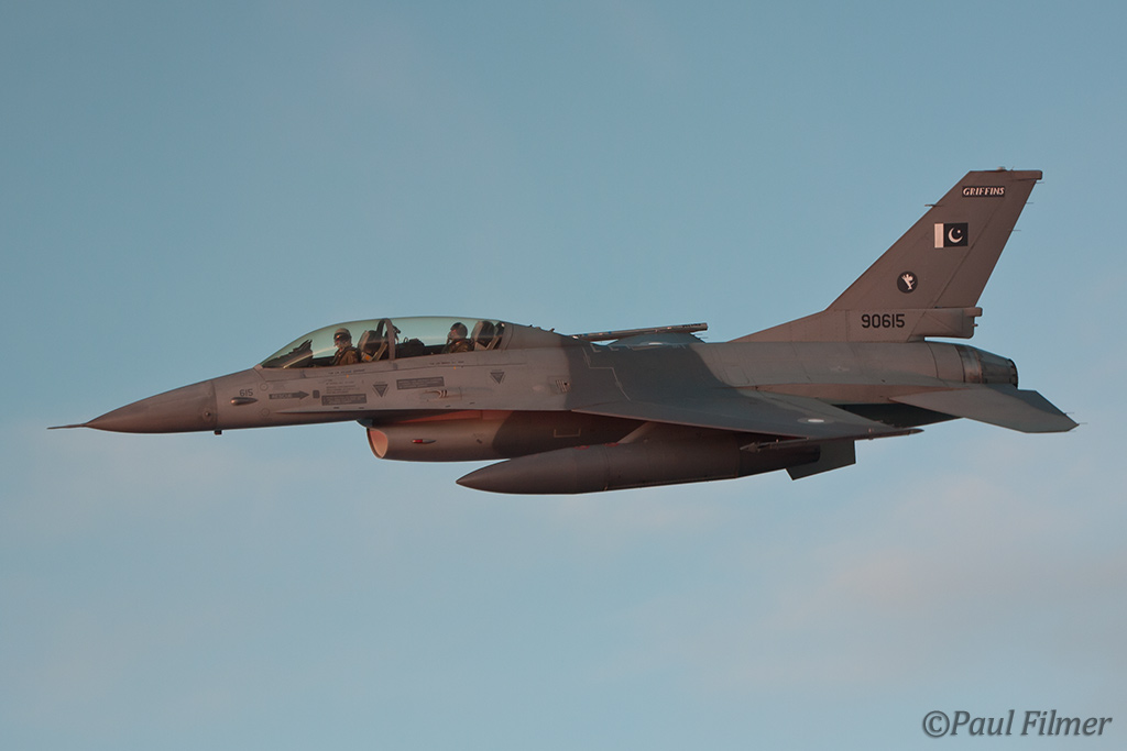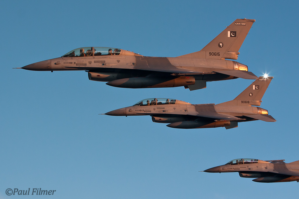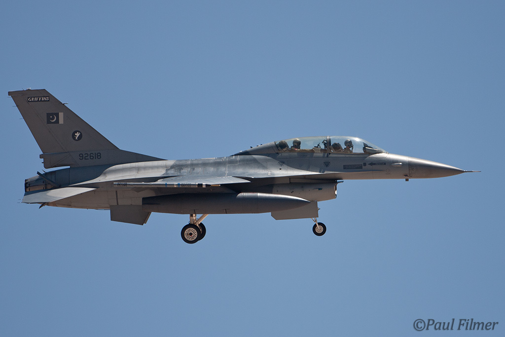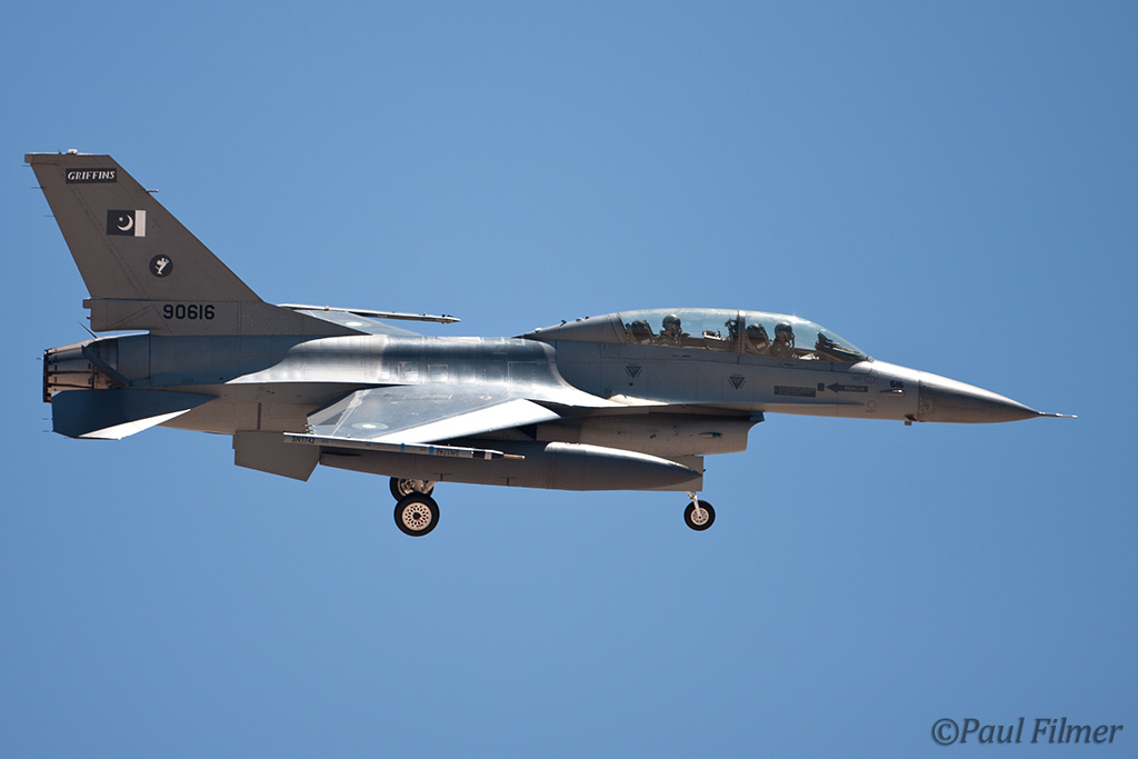 These particular F-16Bs are block 15 machines and were part of the final production run of 40 Bs. They were delivered in the early 1980s and after initial aircrew training at Hill AFB, UT were delivered to Pakistan between 1983 and 1986. US embargos later on in 1990 would mean that parts and support would dry up, but the ever-resourceful Pakistanis still managed to keep all their western equipment flying. This embargo, called the Pressler Amendment, also stopped an order of 71 newer F-16s that had been already ordered and the finished airframes ended up in AMARC. These aircraft would eventually find their way to the US Navy in 2002 for use as aggressors at NAS Fallon with NSAWC; these were a mixture of A and B models. This embargo has since been lifted and new C/D models have now started to arrive in Pakistan.