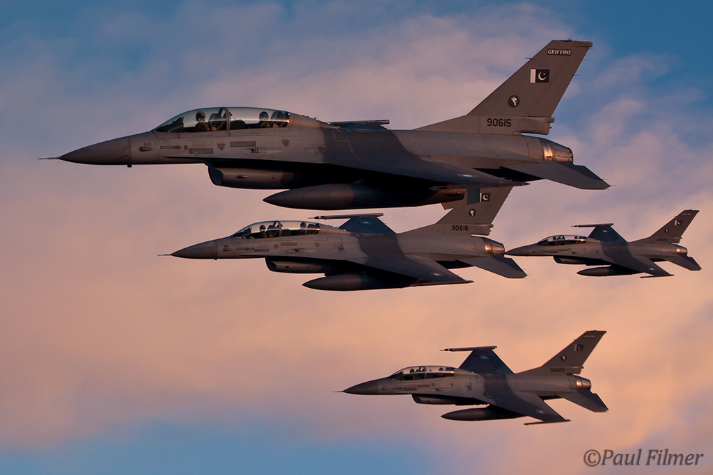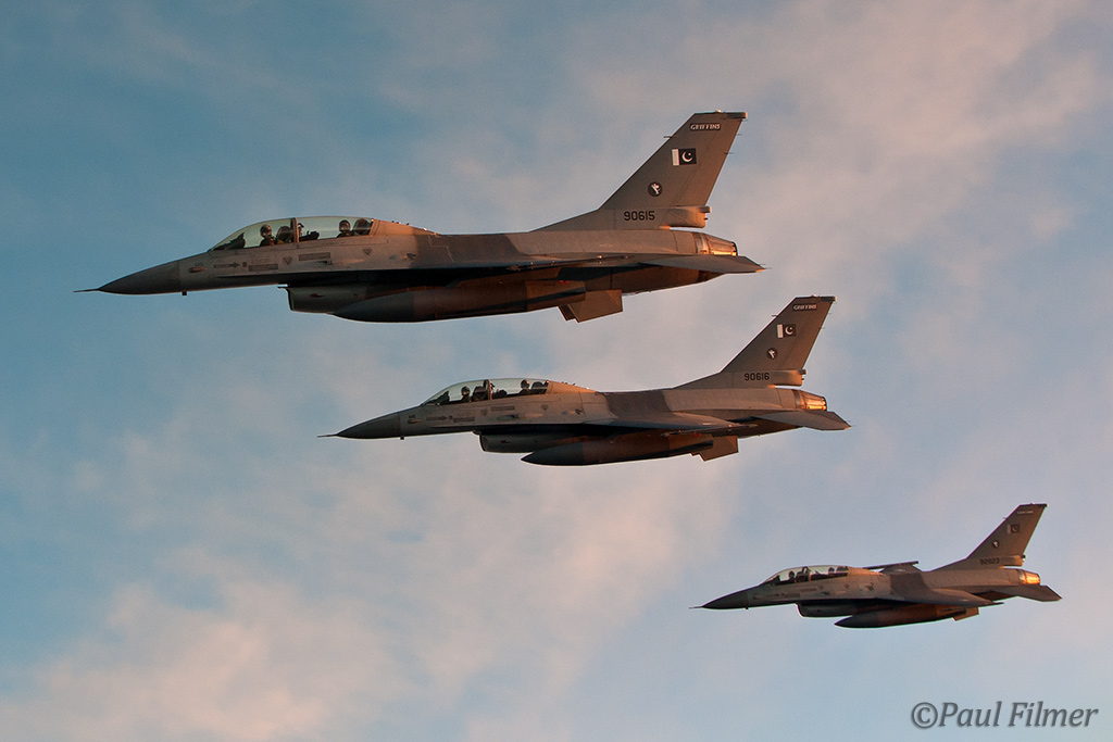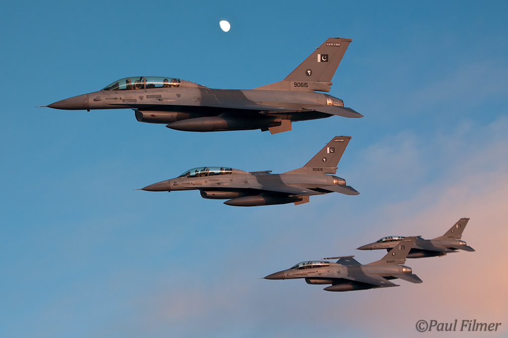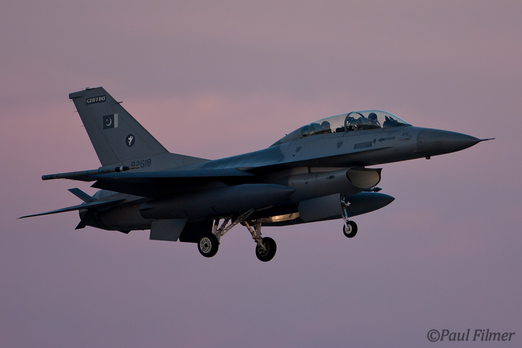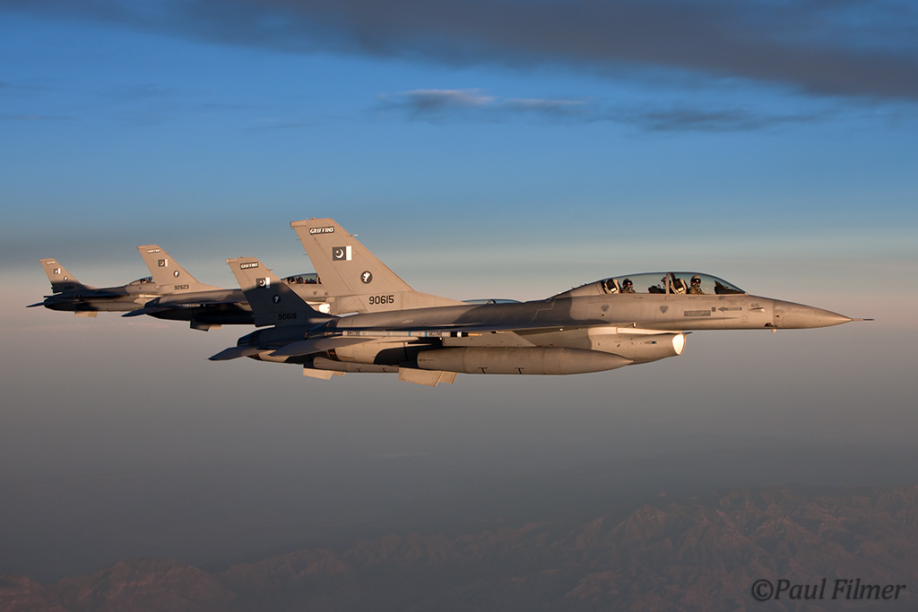 These particular F-16Bs are block 15 machines and were part of the final production run of 40 Bs. They were delivered in the early 1980s and after initial aircrew training at Hill AFB, UT were delivered to Pakistan between 1983 and 1986. US embargos later on in 1990 would mean that parts and support would dry up, but the ever-resourceful Pakistanis still managed to keep all their western equipment flying. This embargo, called the Pressler Amendment, also stopped an order of 71 newer F-16s that had been already ordered and the finished airframes ended up in AMARC. These aircraft would eventually find their way to the US Navy in 2002 for use as aggressors at NAS Fallon with NSAWC; these were a mixture of A and B models. This embargo has since been lifted and new C/D models have now started to arrive in Pakistan.