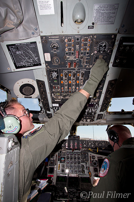 Our flight crew was Instructor Pilot Capt. Nicholas "KOKO" Motlagh, Pilot 1st Lt. Mattew "Rook" Douglass and Instructor Boom Operator Staff Sgt. Logan "Crunch" Berry. This flight was in fact Lt. Douglass' first ever KC-135 mission and he performed the take-off on 21L with the required right turnout to avoid the city. The aircraft was stifling hot on the ground even with the cargo door and over-wing exits open to allow the breeze to circulate, but as we climbed the temperature began to slowly drop until 30 minutes later when the temperature was nigh on perfect.