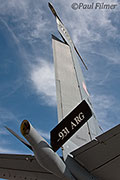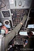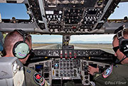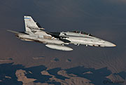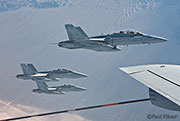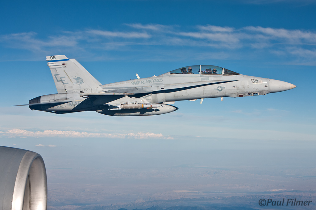 We started our refueling track at flight level 240 waiting for our first customers. After about 40 minutes three specks appeared behind us and low down. These aircraft were the F/A-18 Hornets of VFMA(AW)-225 based at MCAS Miramar and it was surprising just how quickly they formed up on our port wing. The aircraft we were in was fitted with the outboard Multi-Point Refueling System pods (MIPRS), which allows two aircraft that require the basket (hose and drogue) to be refueled simultaneously. The KC-135 can also trail a single basket from the boom, but this needs to be fitted on the ground and stops use of the boom for mixed refueling missions. Unfortunately on the KC-135 when the aircraft are plugged-in to the baskets there is nowhere inside the aircraft that you can actually see the aircraft to take any photos, as they are in a perfect blind spot for all the windows. The boomer uses a series of mirrors to see when the aircraft has contact.