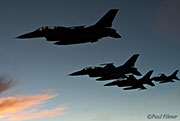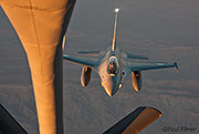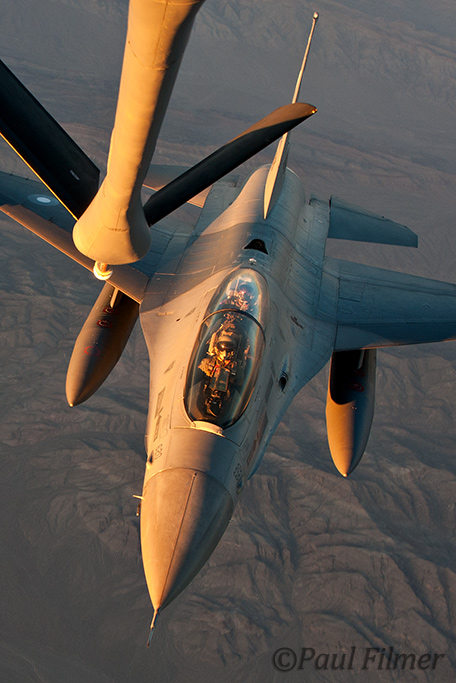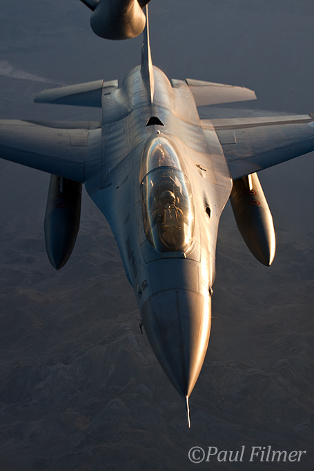 We continued our track waiting for our next customers the Pakistan Air Force with their F-16s. About 45 minutes later the small swarm of four aircraft appeared and formed up on our port wing. Unfortunately the side windows in this aircraft have suffered the scratches from photographers that have had filters attached to their lenses, with the result being that they are nigh on impossible to shoot through as there are literally no clear patches. I had already spoken to the crew on the ground about shooting over the back of their cockpit seats through the side windows and they said this was not a problem. This was my saving grace and my pilot also asked the aircraft if they could move forward in their formation so that photos could be taken. So while the first aircraft took the boom the remaining three formatted for me just as the light was becoming real soft as the sun was ready to set.