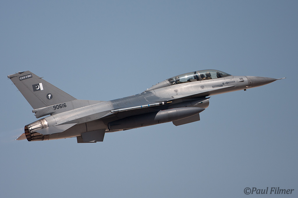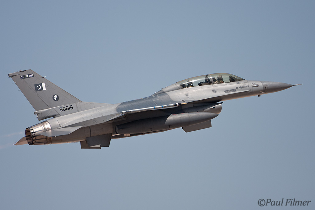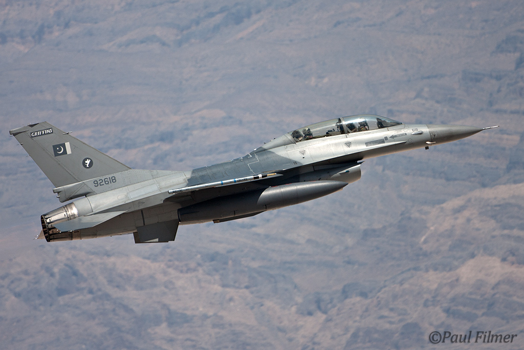 These particular F-16Bs are block 15 machines and were part of the final production run of 40 Bs. They were delivered in the early 1980s and after initial aircrew training at Hill AFB, UT were delivered to Pakistan between 1983 and 1986. US embargos later on in 1990 would mean that parts and support would dry up, but the ever-resourceful Pakistanis still managed to keep all their western equipment flying. This embargo, called the Pressler Amendment, also stopped an order of 71 newer F-16s that had been already ordered and the finished airframes ended up in AMARC. These aircraft would eventually find their way to the US Navy in 2002 for use as aggressors at NAS Fallon with NSAWC; these were a mixture of A and B models. This embargo has since been lifted and new C/D models have now started to arrive in Pakistan.