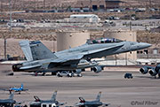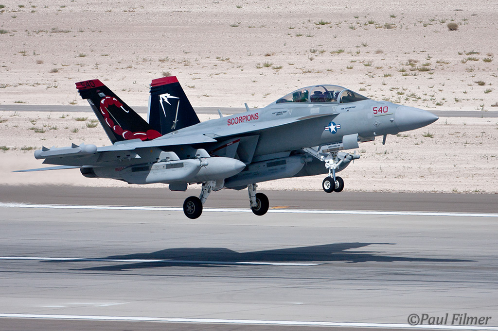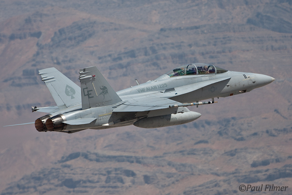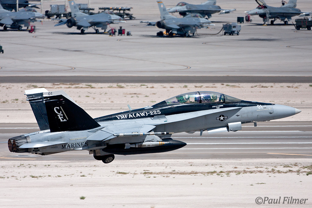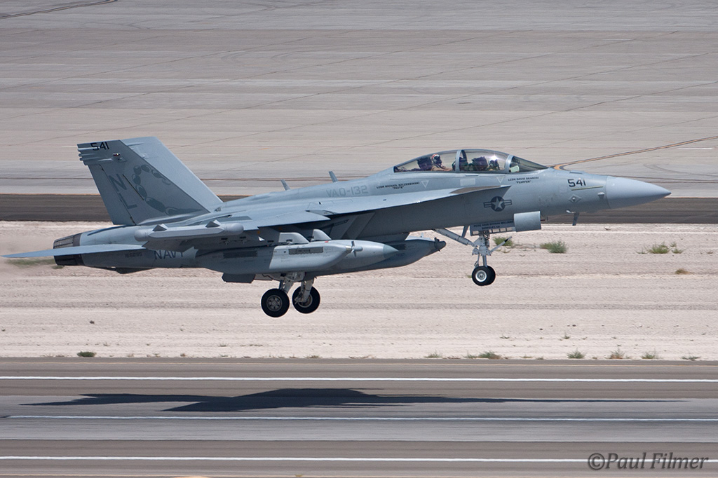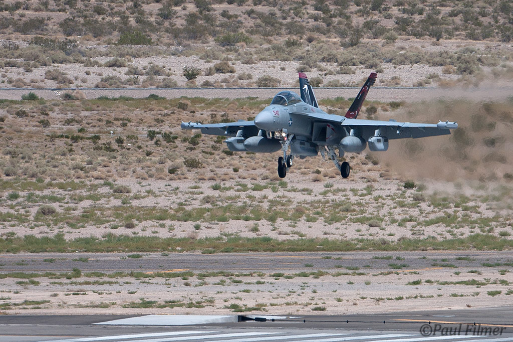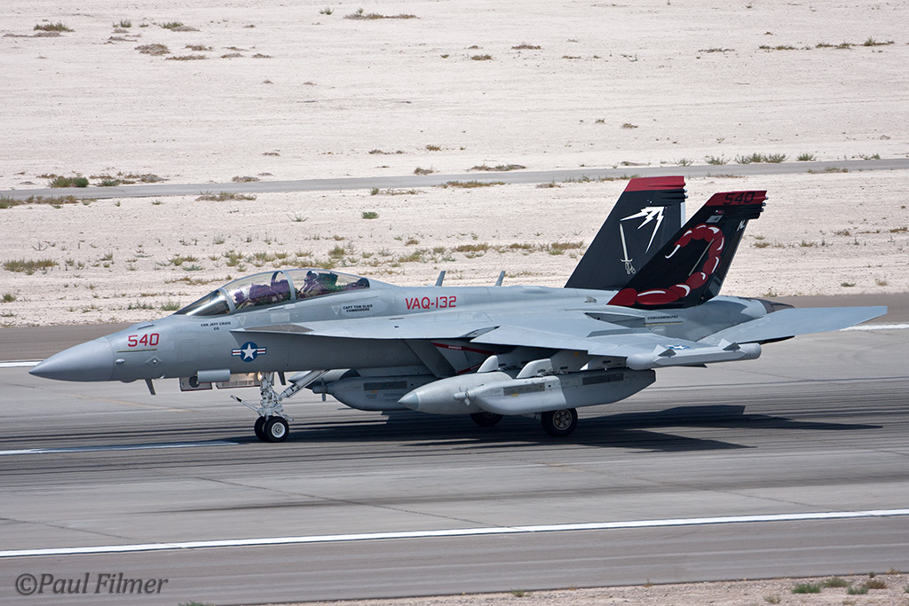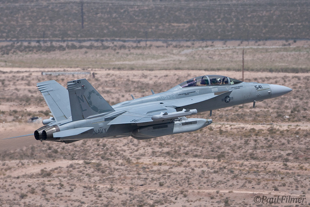 The other players for RF10-4 were in the SEAD (Suppression of Enemy Air Defence) role with the traditional EA-6Bs this time from VMAQ-3 at MCAS Cherry Point alongside the new EA-18Gs from VAQ-132 at NAS Whidbey Island, WA and these aircraft often returned in the break together in a dissimilar formation. Also in this role were the 77FS F-16CMs from Shaw AFB who seem to permanently deployed to Nellis these days, although the strange photo restrictions that we have had to live with for the past year were suddenly lifted as the exercise began.