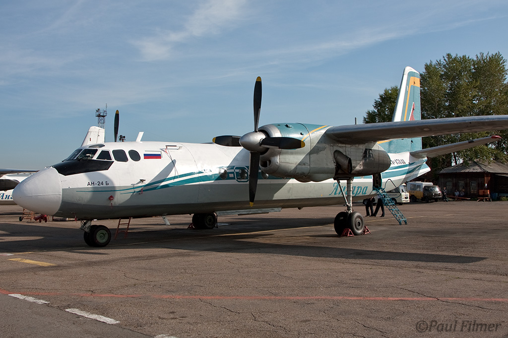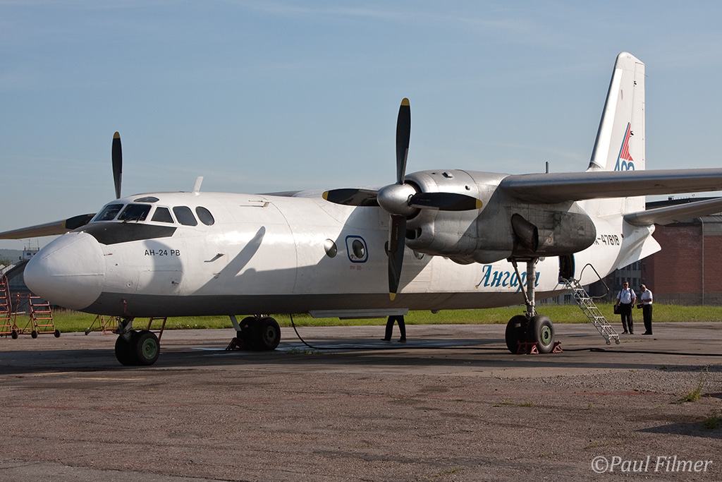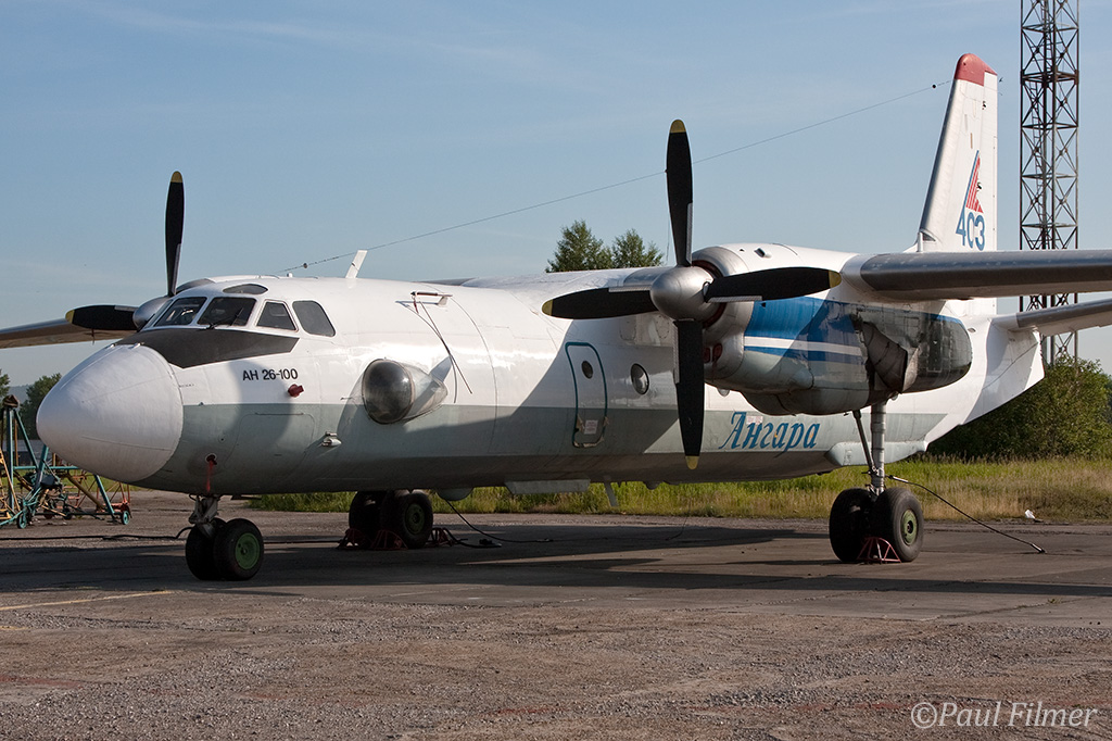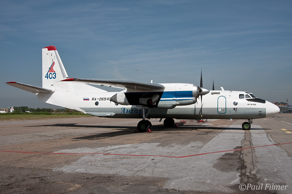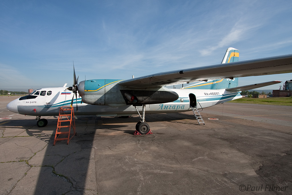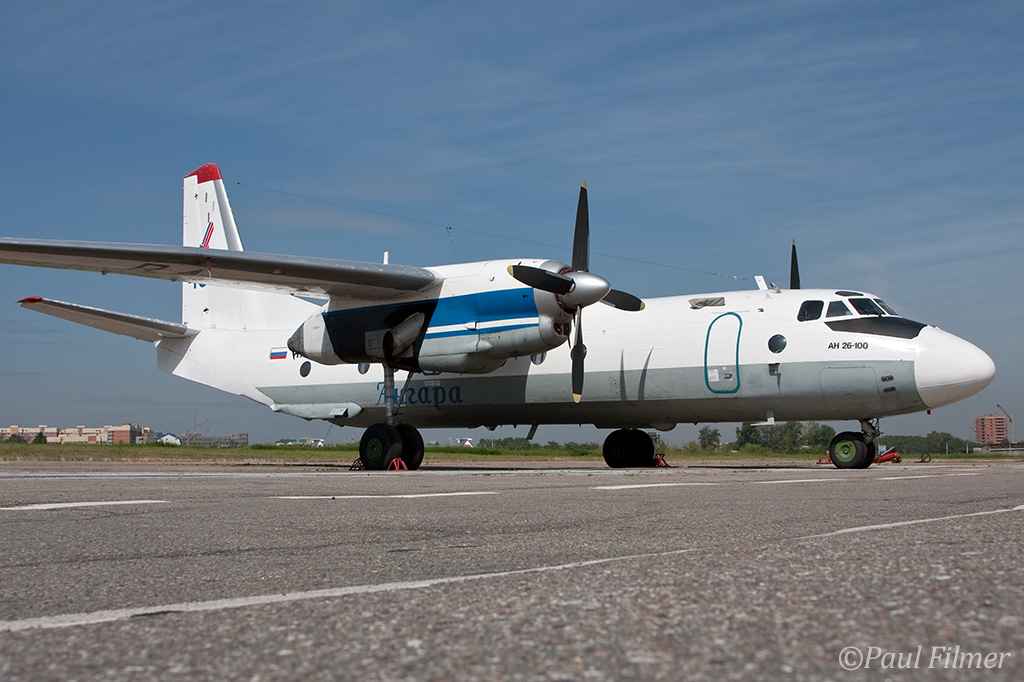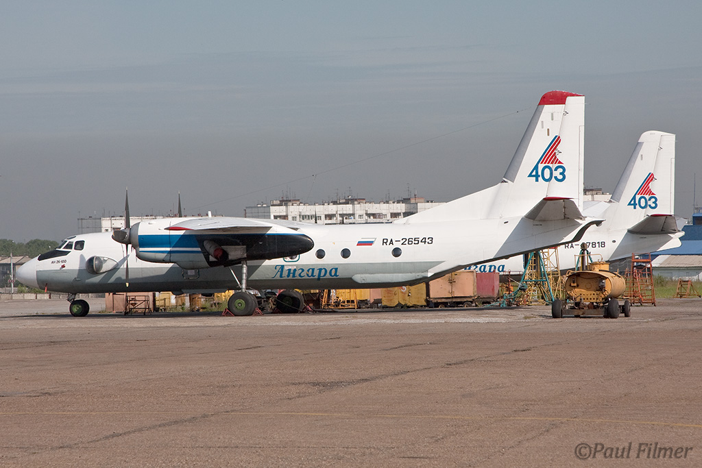 Irkutsk Airport is laid out very strangely. The main ramp outside the terminal was only being used by Russian jet equipment and a couple of Airbus' were parked on a remote ramp towards the runway. The An-24/An-26 ramp is up a hill even further from the terminal next to the rework facility, and there is also a military ramp at the other end of the airfield.