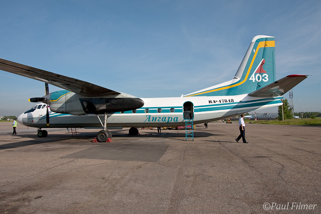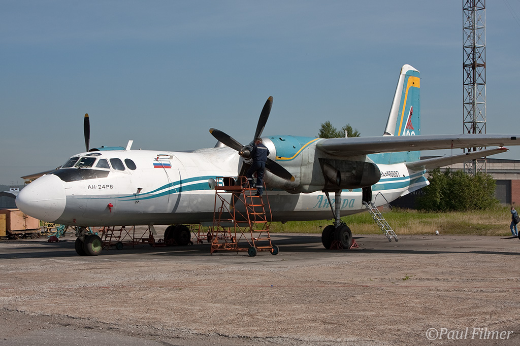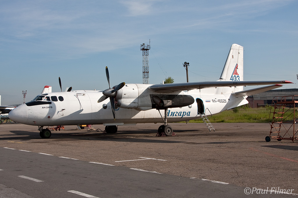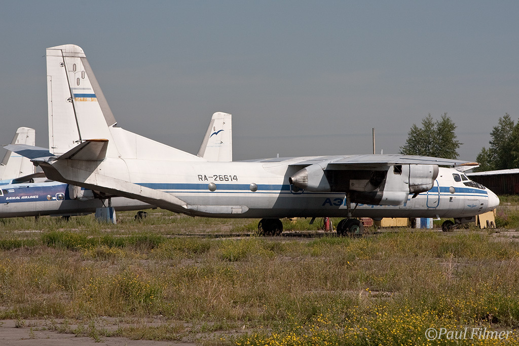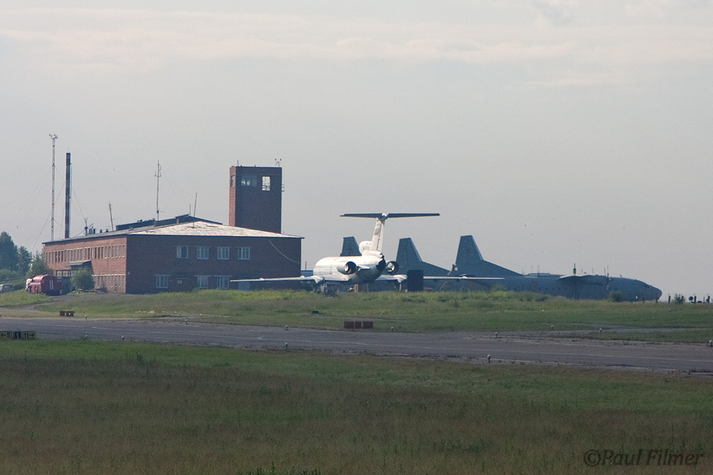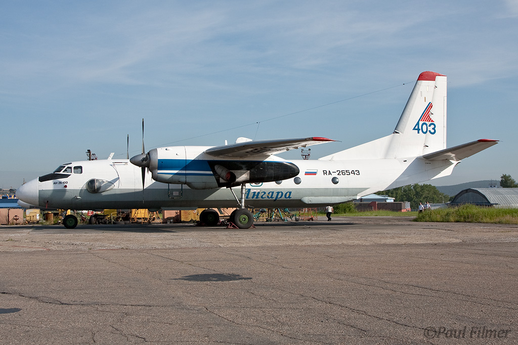 Irkutsk Airport is laid out very strangely. The main ramp outside the terminal was only being used by Russian jet equipment and a couple of Airbus' were parked on a remote ramp towards the runway. The An-24/An-26 ramp is up a hill even further from the terminal next to the rework facility, and there is also a military ramp at the other end of the airfield.