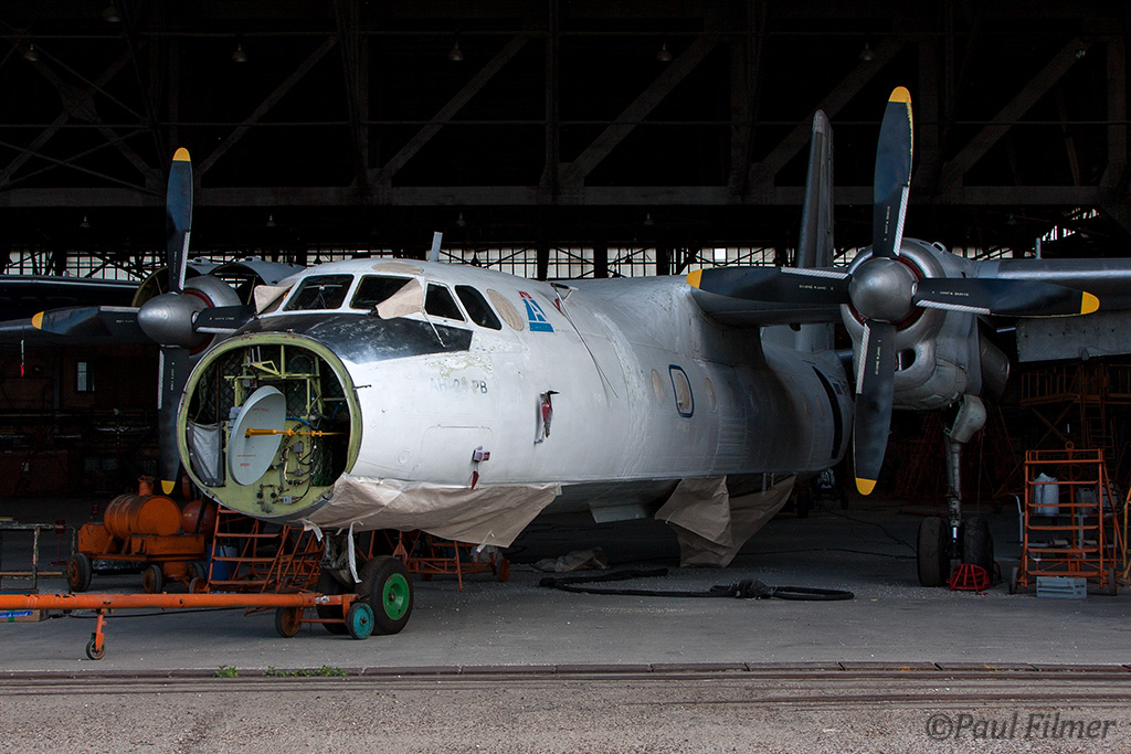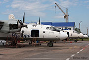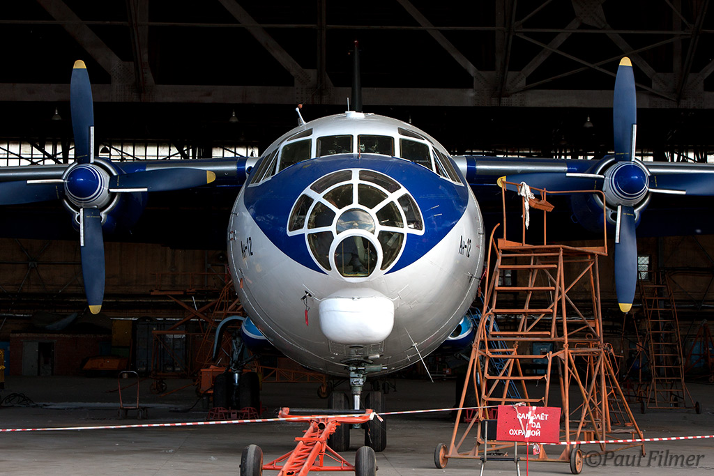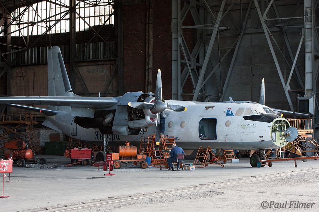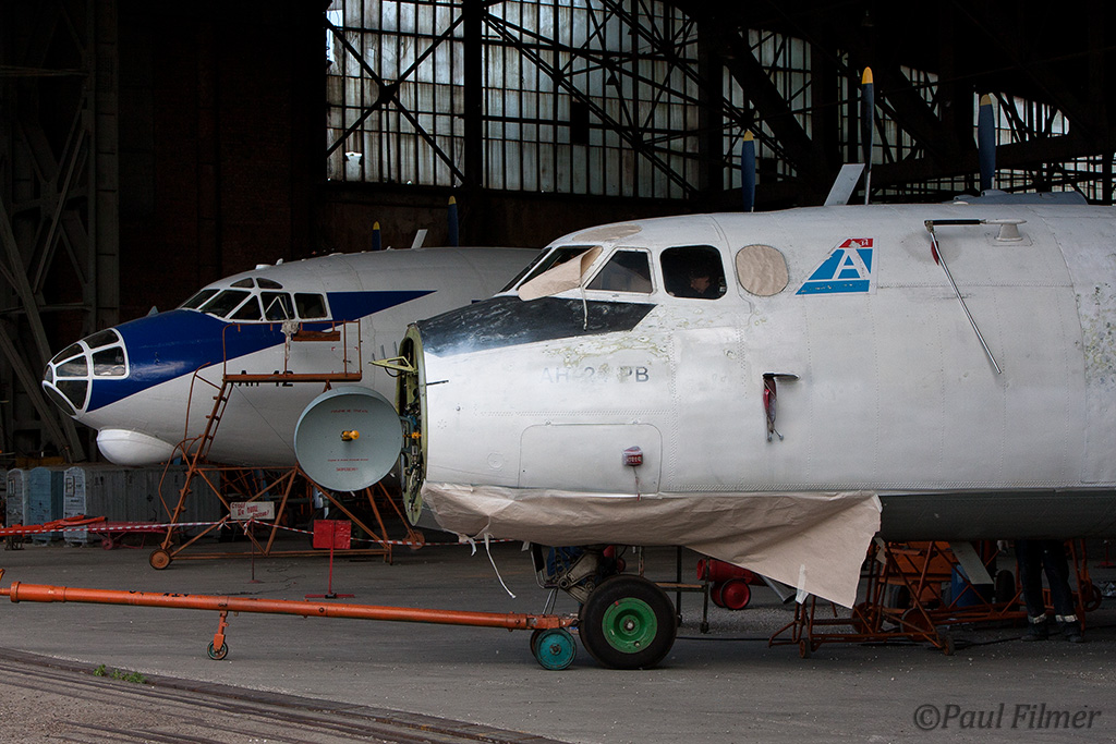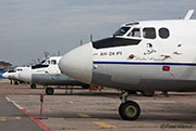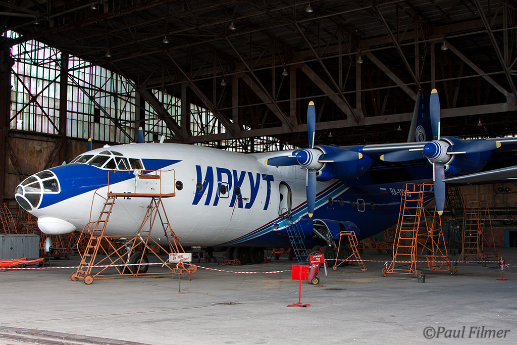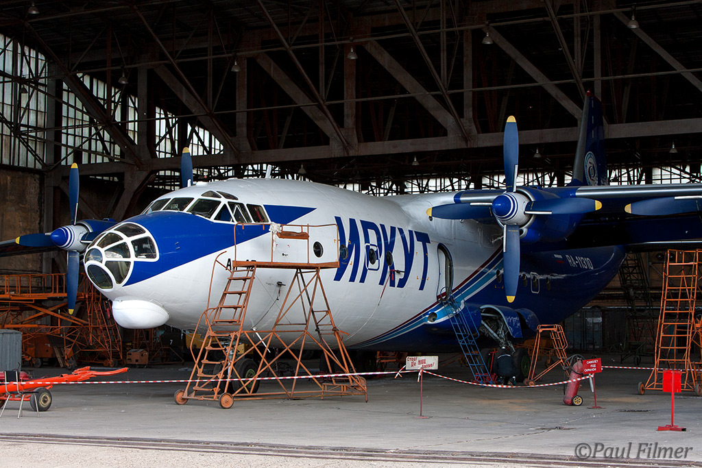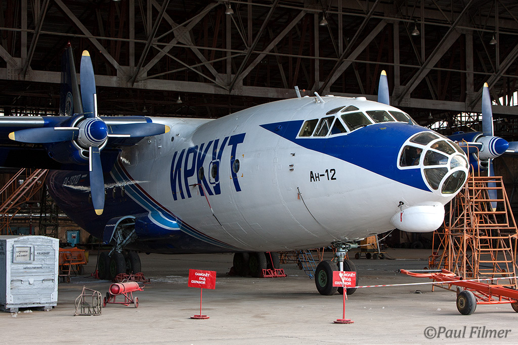 An immaculate Irkut An-12 was being worked on, with an IrAero An-24V on the opposite side.