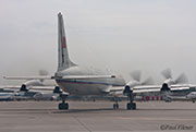 In the mean time the sun appeared as a Tu-134 from UTAir came towards us after landing. We were clear of his path until, at a fast taxi, he turned towards us sending our guide into a mild panic as he tried to usher the group back towards the 757. We complied slightly as the Tu-134 turned away from us again at high speed as the captain opened his cockpit window and gave us all a wave. He was just playing and having fun with us. And so now the sun was out at last, so it was time to get those all important 757 shots again while keeping half an eye on the IL-18 that was still running. Slowly she began to move and was definitely taxing towards us where the Tu-134 had just gone by. The sun was still out as she crossed the inner taxiway onto the ramp we were standing on, but just as she got to us the sun went behind another cloud. It was certainly the highlight of the day to see an active IL-18 move and doubly nice to have one in such close proximity.
