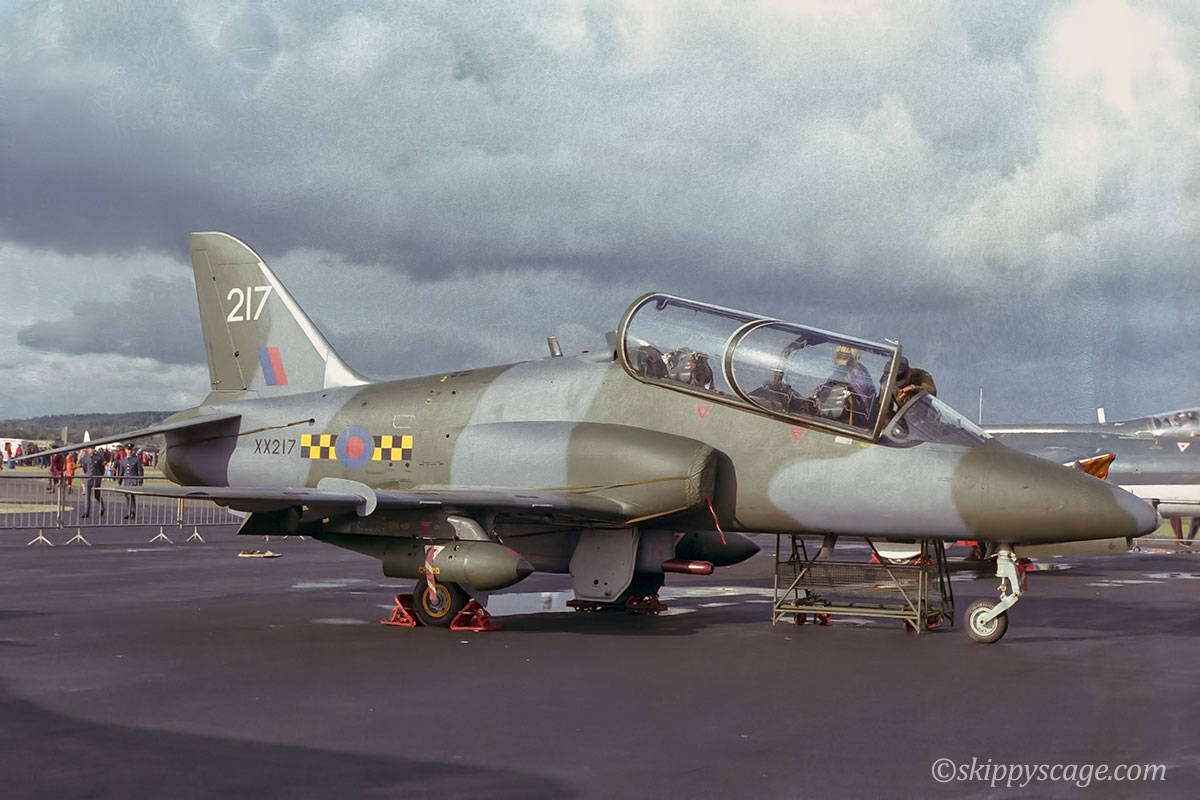 Hawk T.1 XX217 is seen here operating with 63 Squadron. In 2006 it diverted to the Isle of Man with engine problems and was damaged on landing and shipped back to its then RAF Valley home by road.