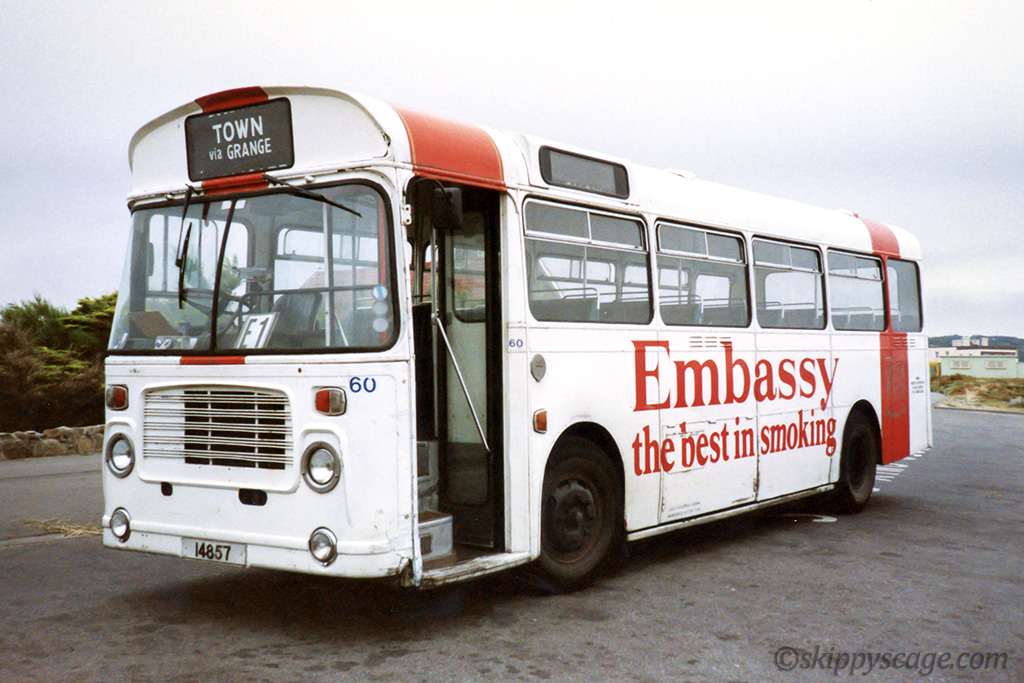 This bus was originally in service with Busways Travel in Tyne and Wear, which is why it had the non-standard small destination window at the front. It was acquired in 1988 It was eventually sold to the mainland in 2000 and scrapped for spares.